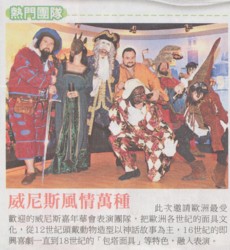 Lo spettacolo proposto per l'occasione dal Tribunal in collaborazione con altri gruppi del CERS, e replicato fino al 5 aprile sul palcoscenico dello Shangri-La Paradise Park, ha offerto al pubblico un vero e proprio viaggio all'interno di cinque secoli di storia del Carnevale di Venezia, dalla medievale "Festa Asinaria" al "Bagordo" rinascimentale, al più classico barocco in bauta e tricorno. "E' stato davvero bello ed emozionante - ha detto il Presidente del CERS Massimo Andreoli - riuscire a coinvolgere in danze e gags improvvisate il pubblico taiwanese, davvero caldo ma completamente diverso da quello occidentale, più abituato a partecipare direttamente alle animazioni in costume". Particolarmente gratificante, la performance offerta in occasione della Giornata Nazionale della Gioventù il 29 marzo davanti a diverse migliaia tra bambini e ragazzi. Grandi applausi hanno riscosso le trovate dell' Arlecchino Antonio Bombarda da Ficarolo , i duelli della Compagnia d'Arme "Cavalieri del Drago" di Castelfranco Veneto e le giocolerie di Gianfranco Gallo di S.Maria di Sala. Colonna sonora dell'intero spettacolo e' stato l'ensemble medievale " Asinaria Festa " di Venezia, arricchito per l'occasione dal musicista reggiano Paolo Simonazzi , di cui il pubblico ha particolarmente apprezzato la Ghironda, strumento della tradizione musicale europea e quindi sconosciuto ai più a Taiwan. Proprio Simonazzi e Flavio “Nirjan” Corvisieri, leader di “Asinaria Festa”, hanno concluso la trasferta taiwanese con una lezione sulla tradizione musicale del medio evo italiano al Dipartimento di Musica dell’Università Nazionale di Tai-Pei. Visita la galleria fotografica su : http://www.cersonweb.org/webit/taiwan.asp mercoledì 5 maggio 2004 |
